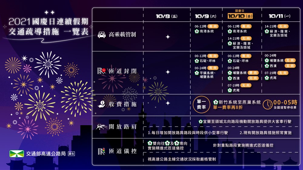 國慶連假收費措施(六、日、一)