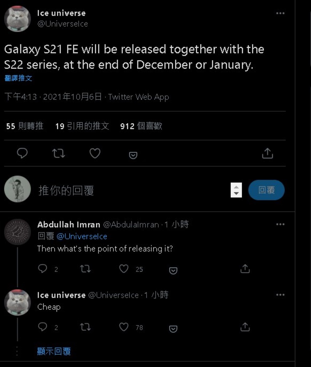 此外,有網友在「冰宇宙」推文問到,既然三星要推出 Galaxy S22,為何還要發表 Galaxy S21 FE?這位爆料者回答的簡單:Cheap(便宜)。
