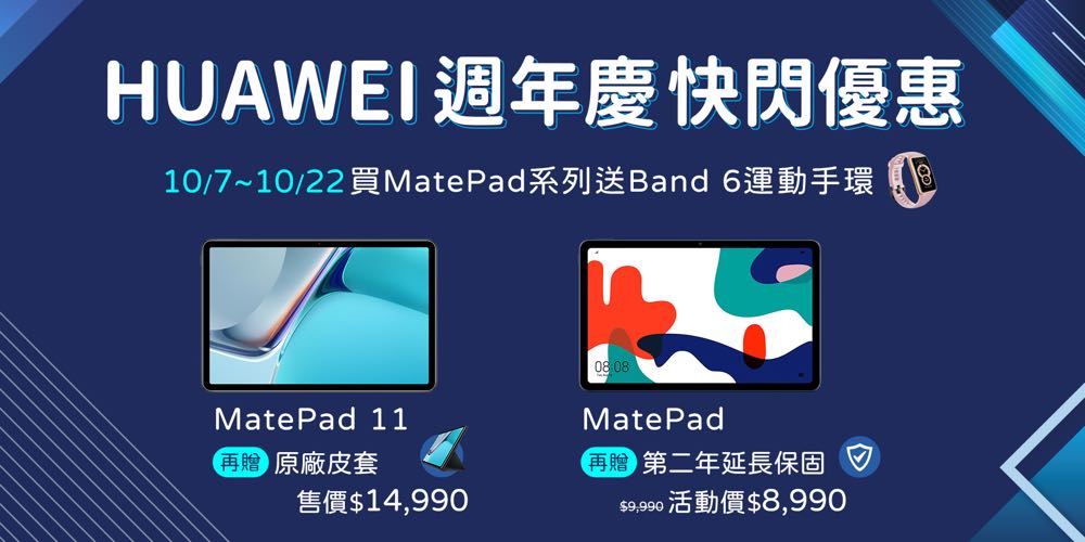 凡於指定門市和通路購買 MatePad 11 加贈一支 HUAWEI Band 6 智慧運動手環與原廠皮套乙組,贈品價值超過兩千元;MatePad 限時推出超殺優惠價 $8,990 (原價$9,990),也贈送 HUAWEI Band 6 智慧運動手環乙支以及登錄即送第二年延長保固。