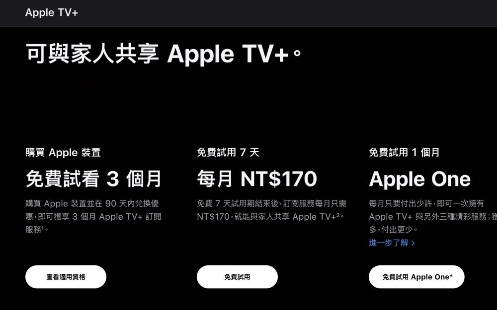 收費標準:$170 / 月 或使用家人共享,購買 Apple 裝置,隨附 3 個月 Apple TV+ 免費訂閱服務。