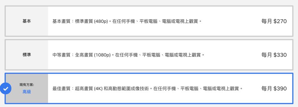 收費標準:基本方案 $270  / 月、 標準方案 $330  / 月、高級方案 $390  / 月