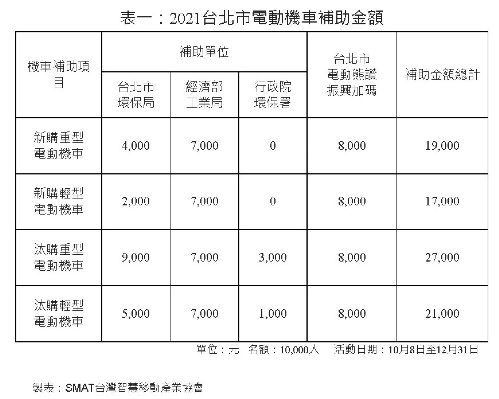 臺北市政府已正式宣布「振興加碼 電動熊讚」方案,臺北市民自 10 月 8 日起購買電動機車,可額外獲得新臺幣 8,000 元的振興加碼補助金,再加上中央政府和臺北市政府原有的電動機車汰(新)購補助,最高可獲得 2 萬 7,000 元補助,期限到今年 12 月 31 日為止,臺北市民可以好好利用本次振興加碼所帶來的額外補助,用最經濟實惠的價格購買電動機車。