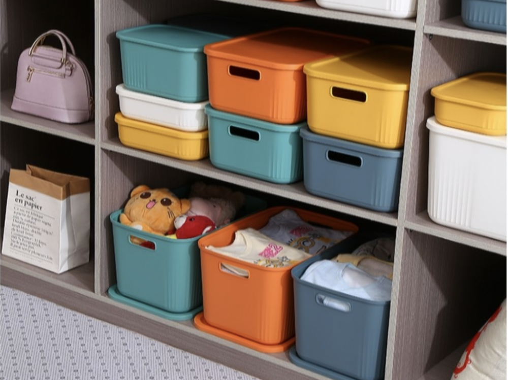 此時有幾個大小不同又能互相堆疊的收納箱就很好用,可依照需求選擇長寬方扁,附蓋的設計讓雜亂一秒消失,少見的撞色設計除了增添居家色彩,也能作為辨識使用,讓收納更直覺。