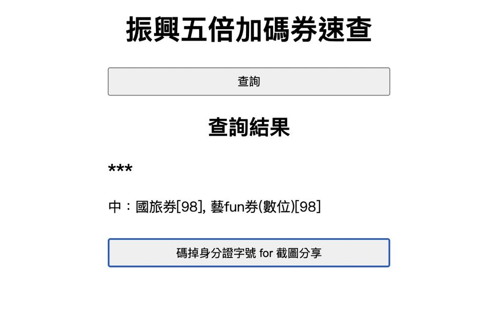 振興五倍券加碼抽籤這週起陸續開始抽籤,抽籤的方式不是身分證後 2 碼就是 後 3 碼,隨著加碼券的陸續抽籤,大家除了可以去五倍券官網核對每種券的抽籤號碼外,也有熱心網友設計了快速查詢工具,只要輸入身分證後 3 碼就能一秒知道自己有沒有中籤!