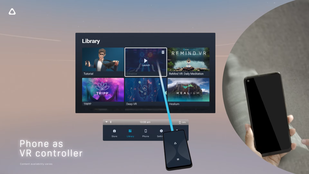 要觀看虛擬實境內容,VIVE Flow 需要與 Android 手機連接,並且搭配 VIVE APP 內容庫使用;另一種方式是透過 Miracast 技術,將手機畫面投放到 VIVE Flow。官方表示,暫時不支援 iOS 作業系統、三星 Exynos 處理器。操作方面,VIVE Flow 可透過藍牙與手機連接,讓手機化身為控制器。