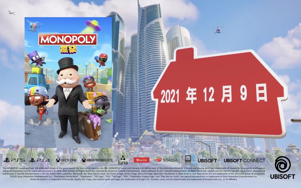 Ubisoft 預告將在 12 月 9 日帶來經典《MONOPOLY 地產大亨》遊戲的最新作品《MONOPOLY 地產大亨:瘋樂》,並於 Xbox One、Xbox Series X|S、PlayStation 4、PlayStation 5、Nintendo Switch 以及 Windows PC(Ubisoft Store)平台發售。
