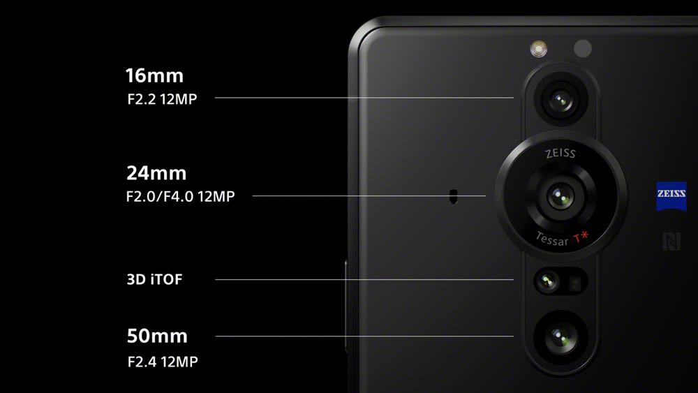 Xperia PRO-I 的三鏡頭皆擁有 T* Coating增透及抗反射塗層鍍膜,同時配有 3D iToF 測距感測器,全新 24mm 為ZEISS Tessar 光學鏡頭能拍出高解析影像,邊緣圖像失真更少,對比度和清晰度更高,另外搭載的 16mm 以及50mm 鏡頭,不同情境轉換鏡頭構圖更豐富,3D iToF 測距感測器,能夠精準偵測、持續對焦和追蹤拍攝物。