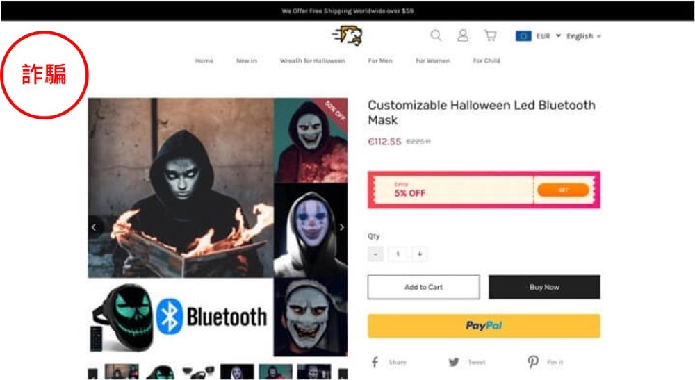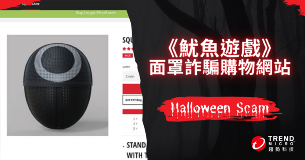 根據趨勢科技觀察,詐騙集團蹭上《魷魚游戲》紅遍全球的熱潮,趁勢利用一頁式詐騙網站,販賣《魷魚游戲》相關裝扮,例如魷魚遊戲面罩或是 123 木頭人公仔等,並搭配假冒的商品圖片,意圖誘騙民眾上鉤。此外,同樣看準萬聖節裝扮商機,不少以假亂真的詐騙網站也紛紛出籠,詐騙份子會利用難以抗拒的「優惠價格」、「限時購物」等詐騙訊息,催促民眾盡快下單而誤入詐騙陷阱。