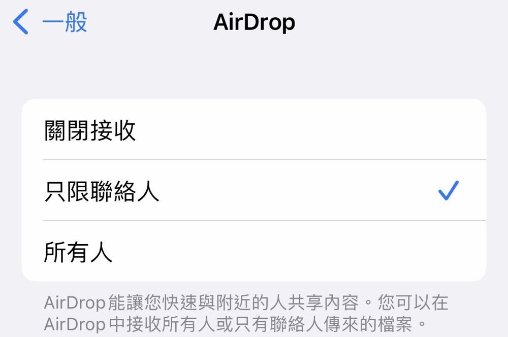 - 「僅限聯絡人」:只有我們裝置裡的聯絡人可以在 AirDrop 看到我們的裝置。(適用於支援 iOS 10 和以上版本、iPadOS 或 macOS Sierra 10.12 和以上版本的裝置)