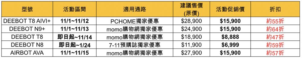 ü 11/1~11/12,於 PCHOME 購買 DEEBOT T8 AIVI+,即享優惠價 NT$15,900。