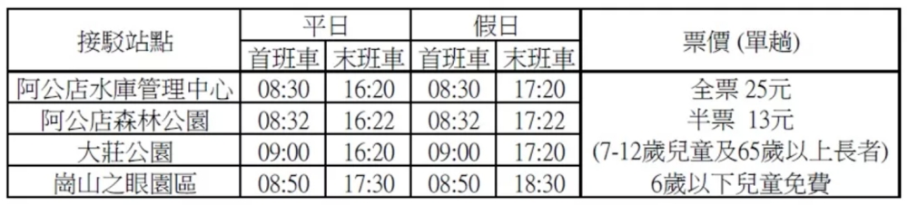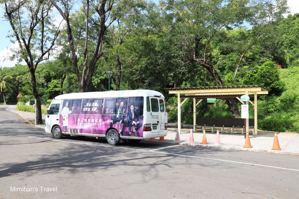 - 岡山之眼接駁車:阿公店水庫管理中心、阿公店森林公園、大莊公園三個上山接駁點,旁邊皆有停車場;崗山之眼園區是下山班次。單程全票25元,每20~30分鐘一班。