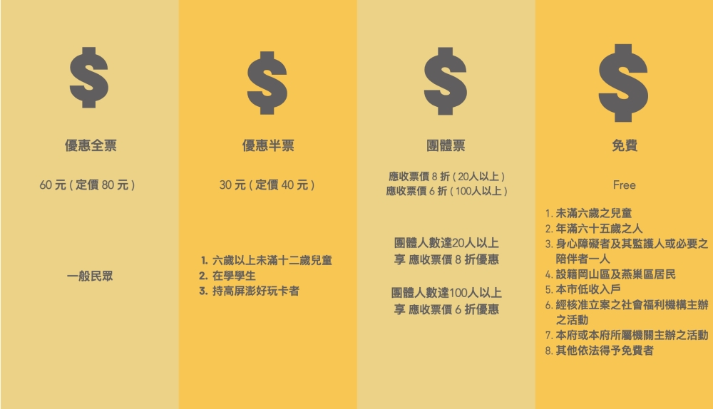 - 免費:未滿6歲、年滿65歲、身心障礙者及陪伴者一人、設籍岡山燕巢居民、高雄本市低收入戶