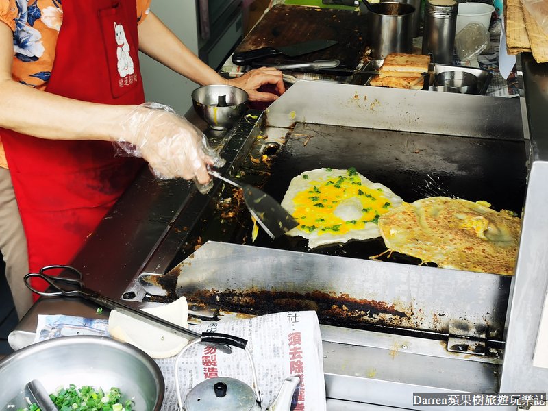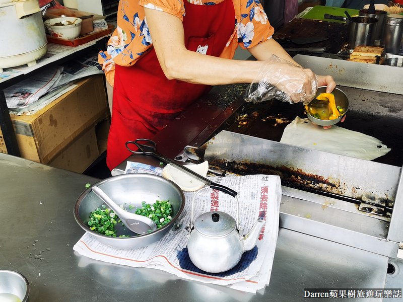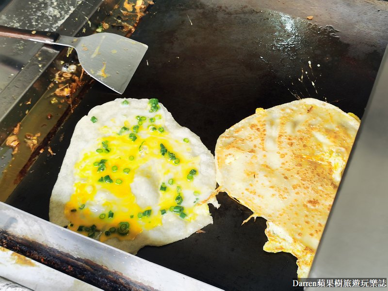 尤其是蛋餅皮在煎台上發出滋滋的聲音,加入蛋液以及蔥花散發出香氣很誘人,不少客人看起來都是在地人,穿著拖鞋短褲還會跟店家寒暄幾句