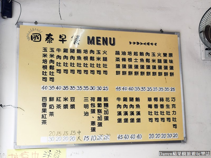 國泰蛋餅早餐店菜單有蛋餅、吐司、漢堡、蘿蔔糕、飯糰、豆漿、米漿等等,來到這裡主要是想買蛋餅,所以其他就都直接PASS,我看到有人買飯糰加蛋份量也不小,原味蛋餅也只要25元