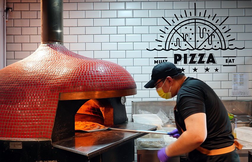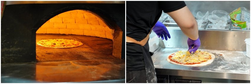▼師傅將起司鋪好鋪滿後,將披薩直接送進窯烤爐,出來就是一份香噴噴的薄皮披薩啦!