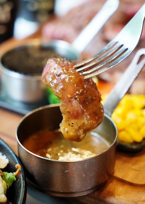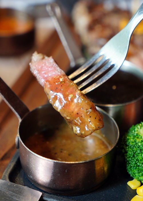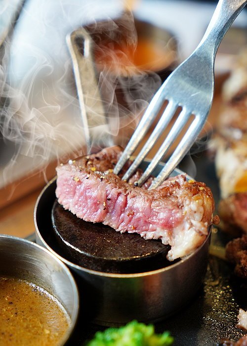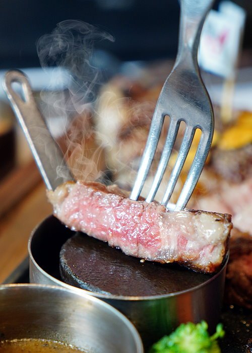 ▼我們在鑄鐵石塊上稍微加熱一下,每一口都吃到熱騰騰的牛排,還能調整熟度,享受DIY的樂趣!接近7分熟的熟度吃起來雖然口感稍微紮實些,但帶點Q彈口感,味蕾也豐富許多,很可以耶!