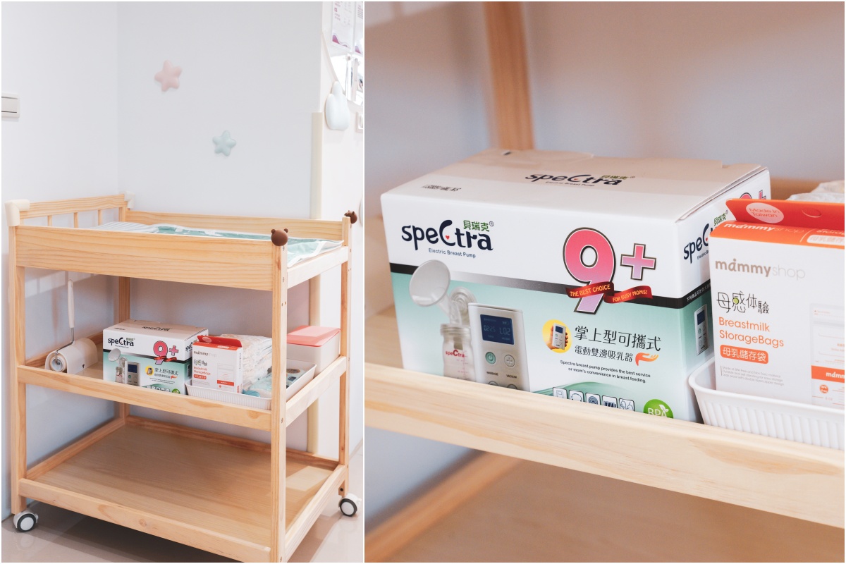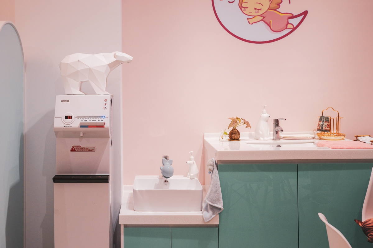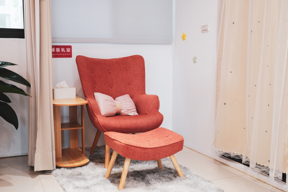 幼兒玩樂區域的後方,則是洗手間、尿布台、哺乳空間,媽咪們可以在這裡好好放鬆的集乳,若是有需要,這邊也有貝瑞克集乳器、母乳保存袋可以使用。另外還有為了孩子們設計比較低矮的洗手台,方便孩子們洗手,落實親子友善。