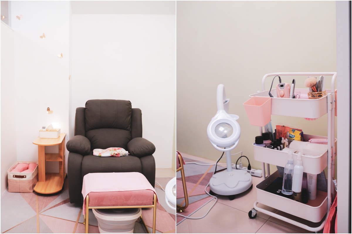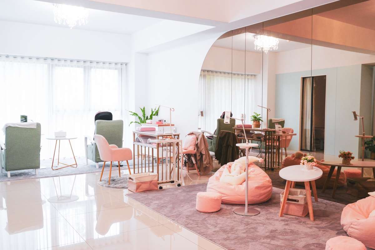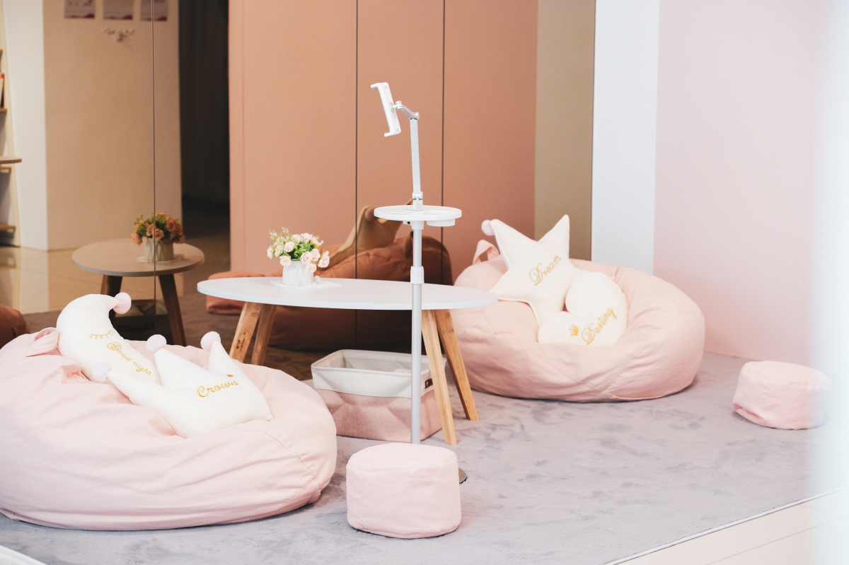 二樓則是整層樓的媽媽休息區!有預約美甲、美容、按摩的媽咪們也都是在這層空間體驗享受哦!若是沒有特別想要做美甲、保養的課程,在旁邊粉色的懶骨頭空間,可以讓媽咪們單純的放鬆追劇,度過沒有孩子轟炸的悠哉時光。