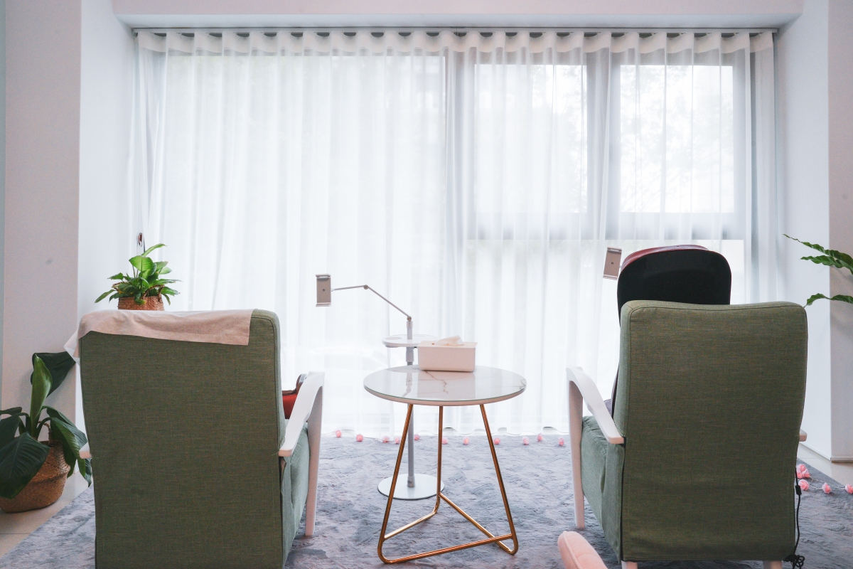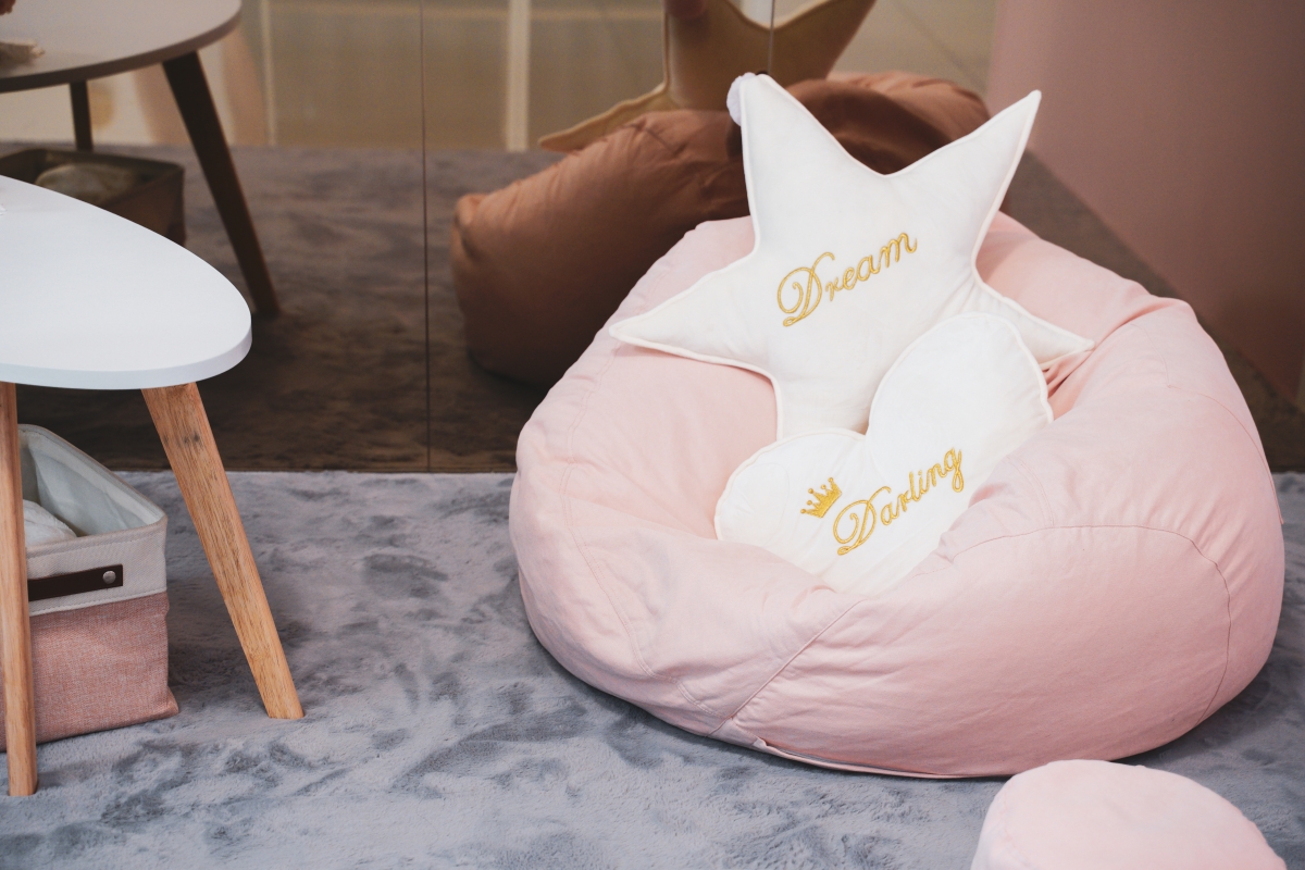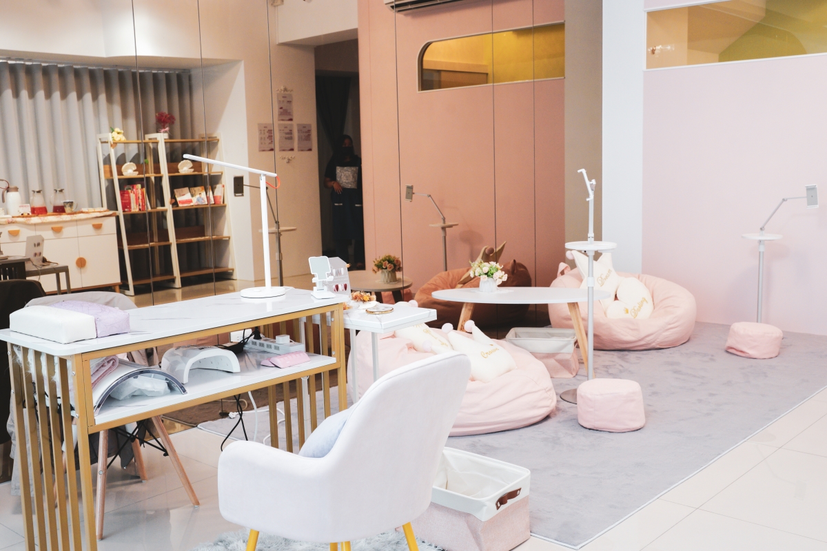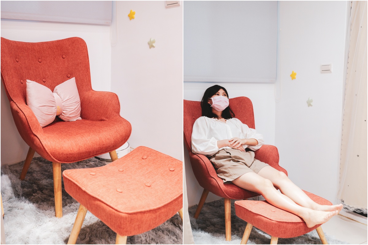 二樓則是整層樓的媽媽休息區!有預約美甲、美容、按摩的媽咪們也都是在這層空間體驗享受哦!若是沒有特別想要做美甲、保養的課程,在旁邊粉色的懶骨頭空間,可以讓媽咪們單純的放鬆追劇,度過沒有孩子轟炸的悠哉時光。