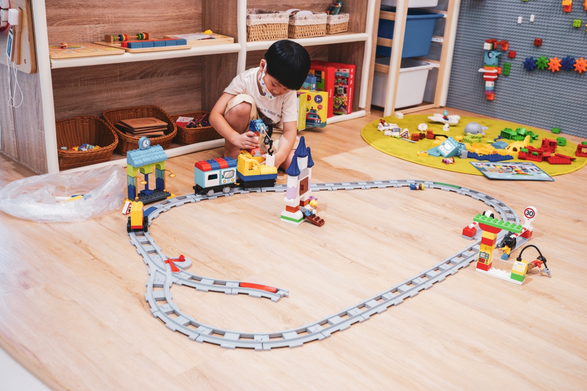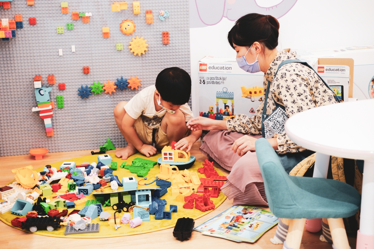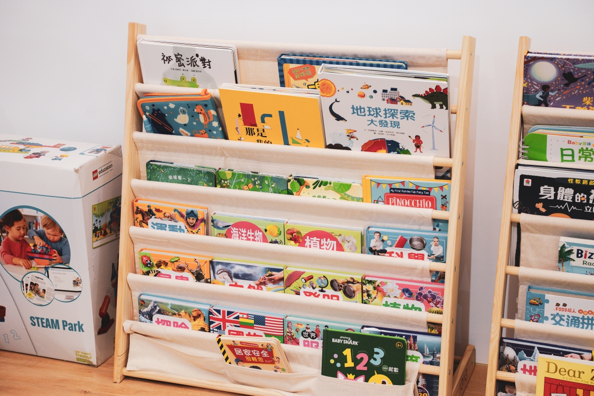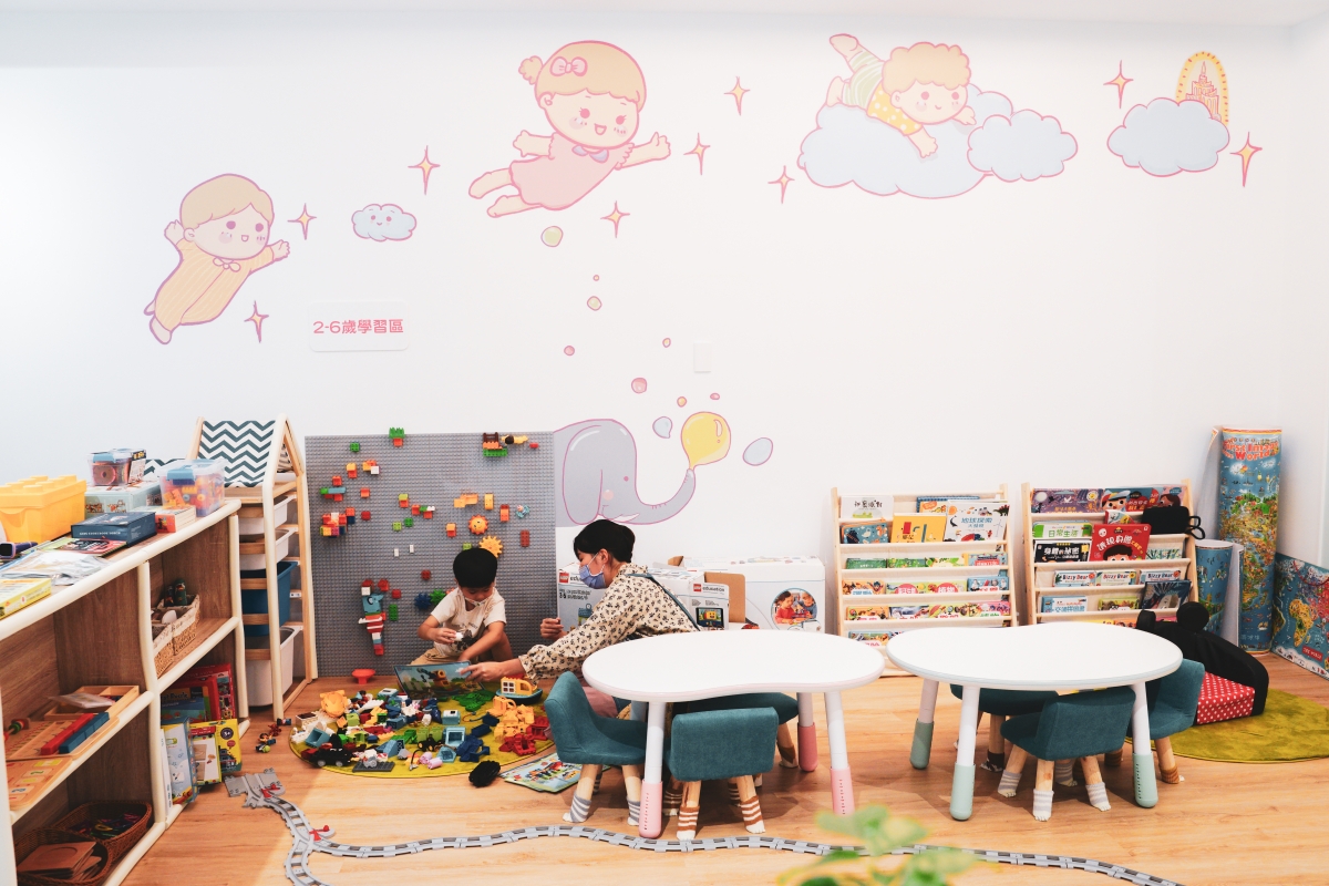 媽媽放輕鬆&親子育樂園共有兩層樓大空間,一樓主要是孩子們的育樂空間,有分 0-1 歲寶寶區與 2-6 歲學習區,裡面的教具、圖書都是有特別挑選過的,而且有許多高質感的 STEAM 玩具,阿福玩的超級開心!因為有很多工程、科技的概念,放進玩具裡面,讓孩子在玩樂中感受到刺激、挑戰,可以動腦去開啟更多新玩法。我後來也有去看阿福玩的那組火車軌道玩具,看到我自己都想玩了!真覺得現在小孩好幸福,小時候就能接觸到很多不同領域的知識,在玩樂中學習,擁有多元化的刺激,直接玩到忘記媽媽不在身邊,有老師在旁邊一起玩就很開心了!