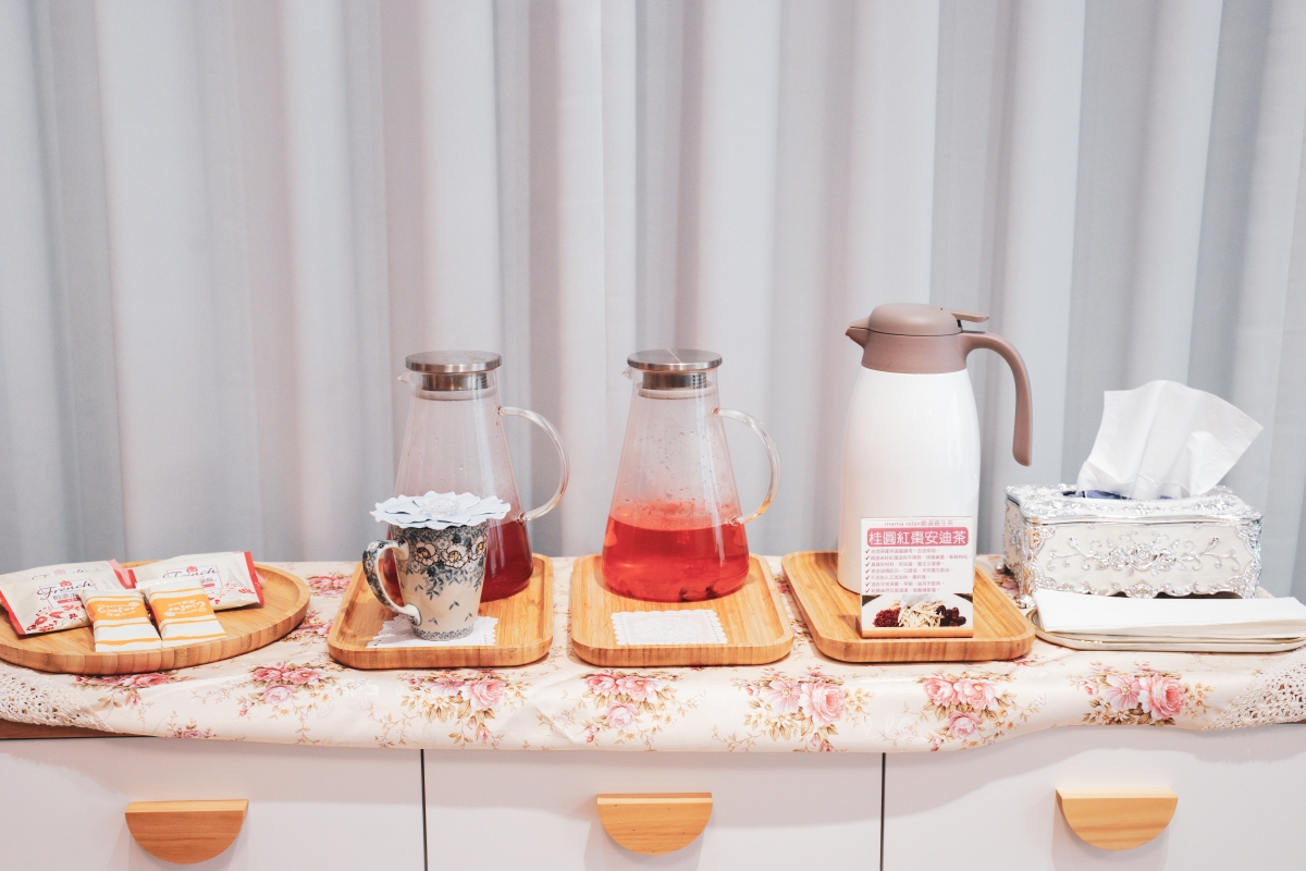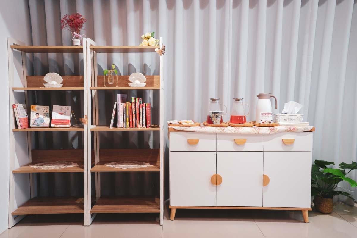 二樓的空間還配有閱讀書架與茶水區,花果茶、桂圓紅棗茶給媽咪們自由取用哦!