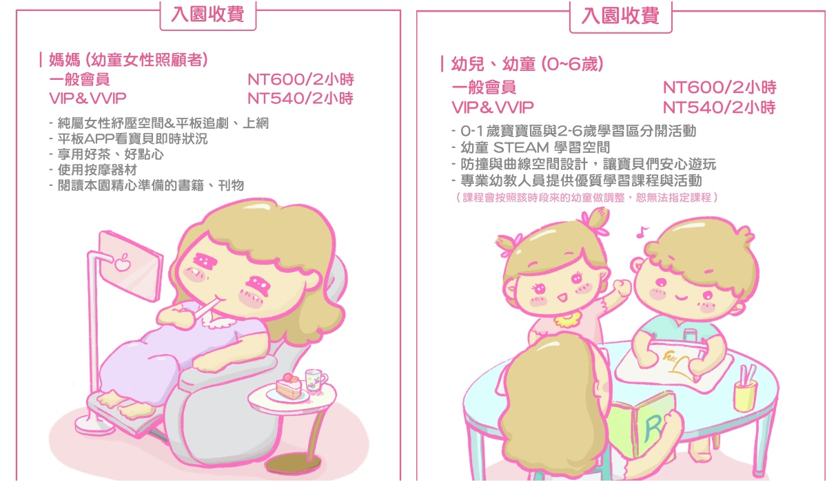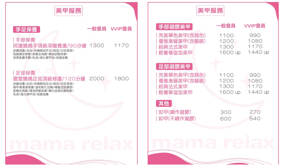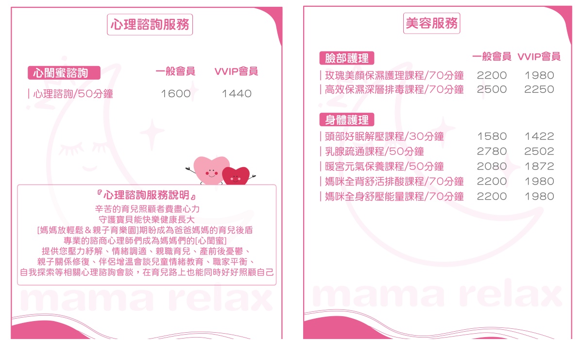 提供空間休息、心理諮詢、美甲、美容服務,收費方式透明公開,一位媽咪+一位孩子,就是 600 元 + 600 元。假如有選擇課程,像是手部單色美甲,那就是 1100 元 + 孩子一位 600 元,計算方式簡單明瞭,若是儲值成為 VIP/VVIP 便能享有更優惠的價格,如果有任何不了解的話,也可以打電話或是私訊店家粉絲團詢問哦!