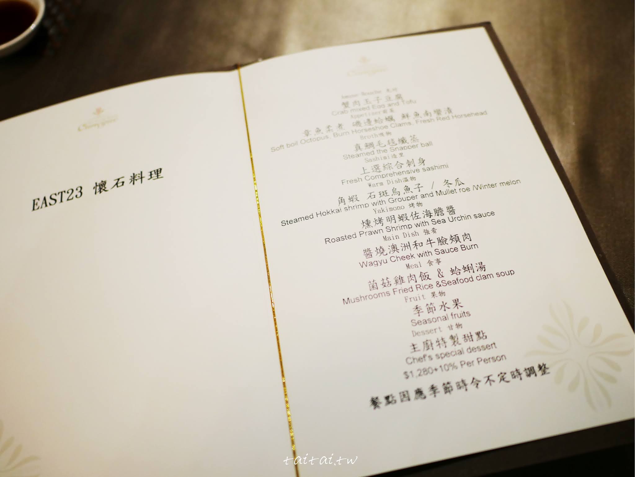帶著盛怒來到23F東西匯,看到窗明几淨的位置氣就消了一半。這裡有分成東、西式,EAST 23提供懷石料理與鐵板燒,WEST 23則是歐陸料理與下午茶。我們享用的是 EAST 23 的懷石料理(NT.1280+10%)。