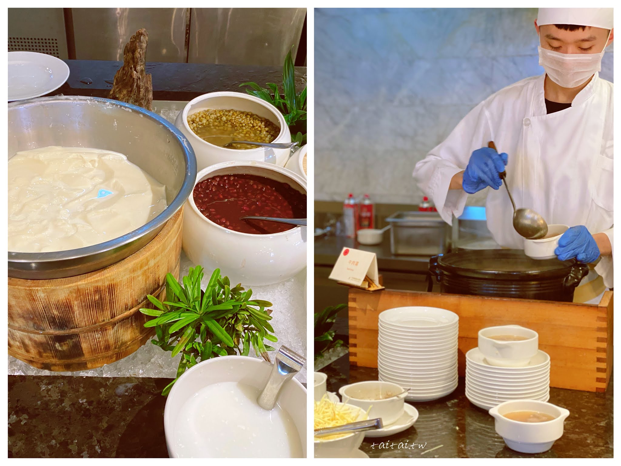 明廚百匯的菜色非常澎派有誠意,蔬菜沙拉的種類頗多(我很在意飯店的生菜XD),日式蕎麥麵跟壽司,還有宜蘭在地美食鴨賞、筊白筍與玉米筍…等在地農產品,我覺得比較特別的是現烤的披薩、古早桶裝豆花、還有現燙的牛肉湯、以及多種口味哈根達思冰淇淋(早餐有哈根達思我真的很佩服)。