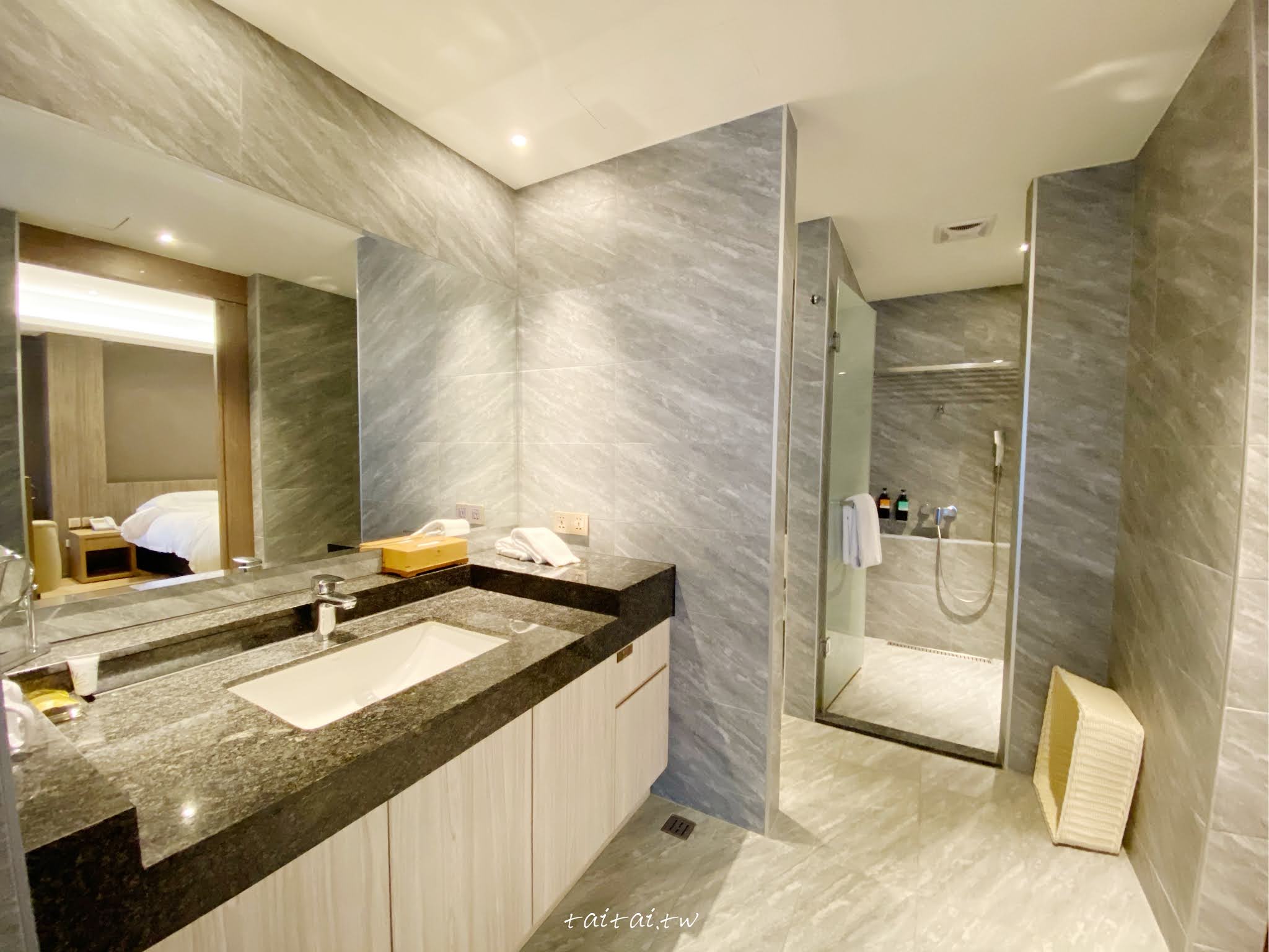 村卻國際溫泉酒店的主打特色,就是每間客房都有室外陽台,陽台於我來說是還好,但每個房間的浴室都備有雙湯池,我就很感興趣了。乾濕分離的浴室面積也不小,兩種泉源分別是碳酸氫鈉泉以及俗稱牛奶浴的奈米氣泡浴。