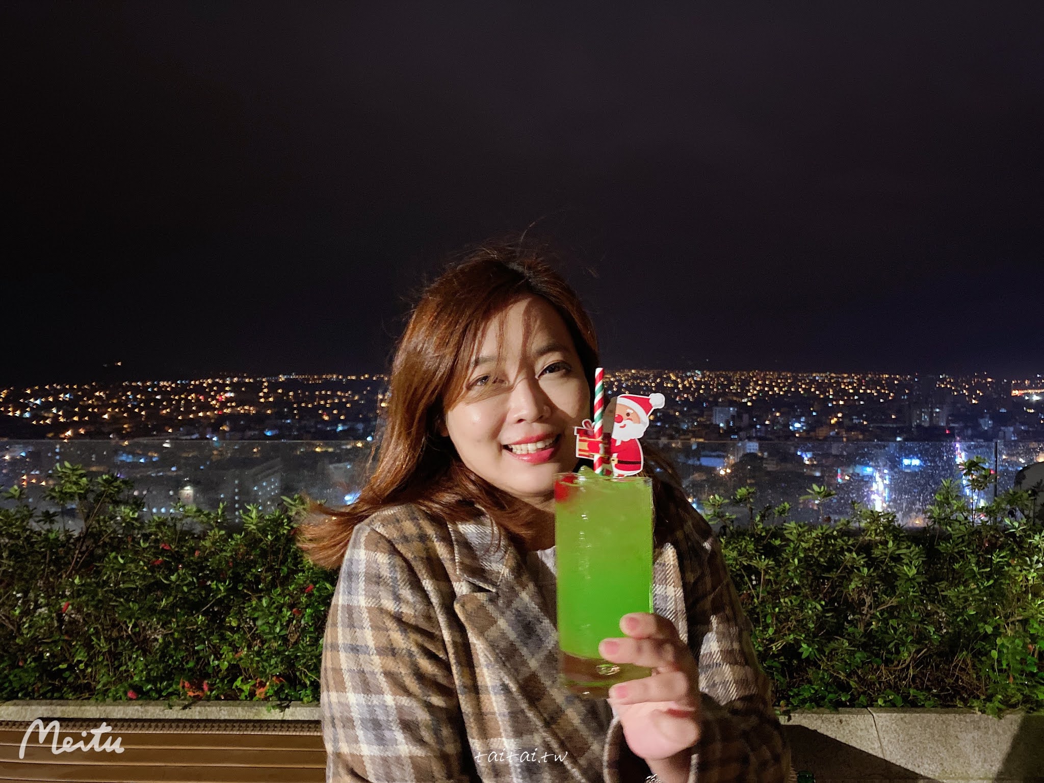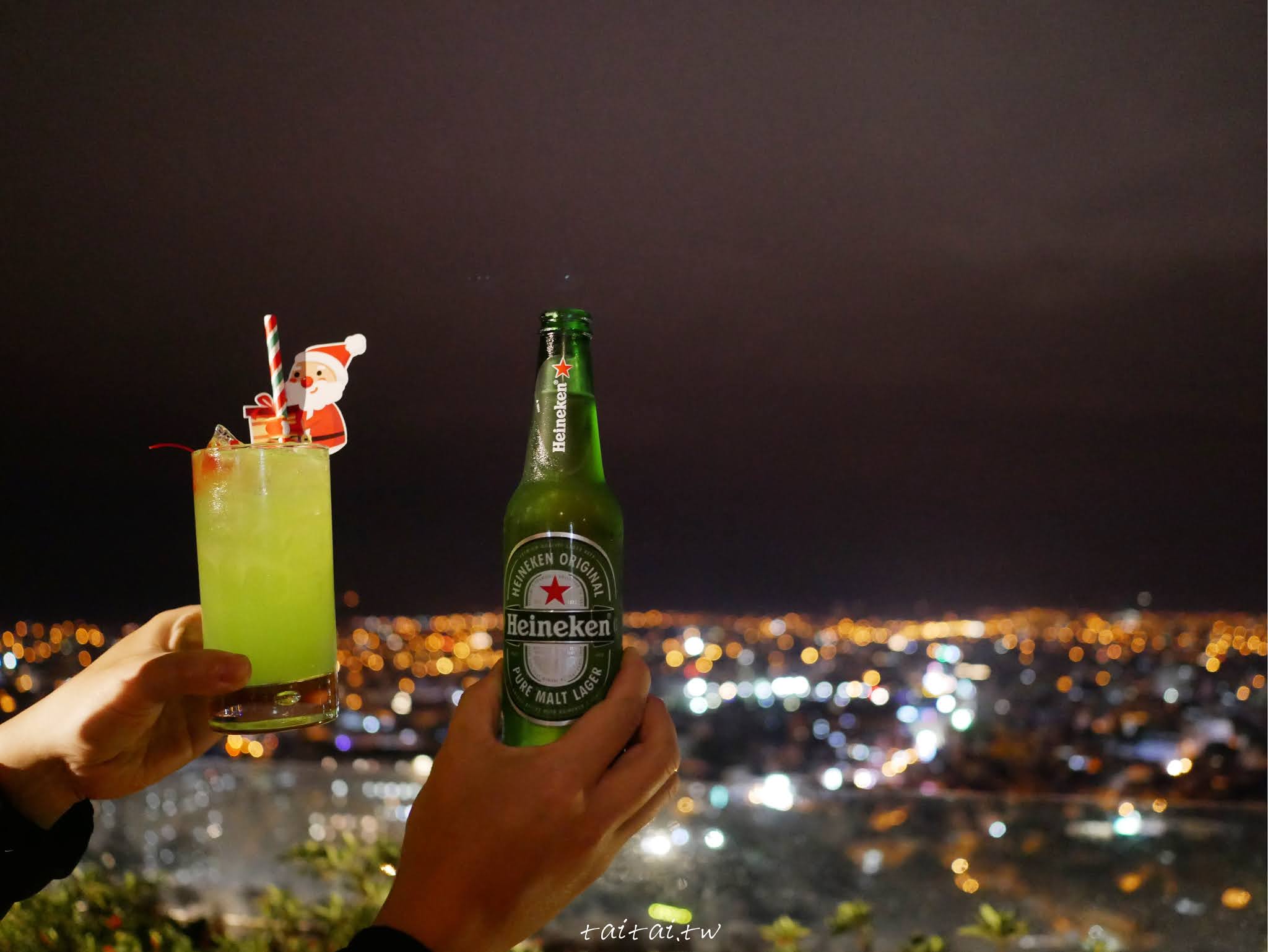 我們點了一瓶海尼根、還有一杯以哈密瓜口味的村卻特調,還有可愛的聖誕老人裝飾,非常應景。比較可惜的是當天下著小雨,風景最好的室外露天座位沒能開放,但我們還是有到外頭玩耍一下。(不過聽說目前正在增建雨遮設備)不得不說風景真的很棒,一眼望去毫無遮蔽,不愧是改變蘭陽平原天際線的最高建築!