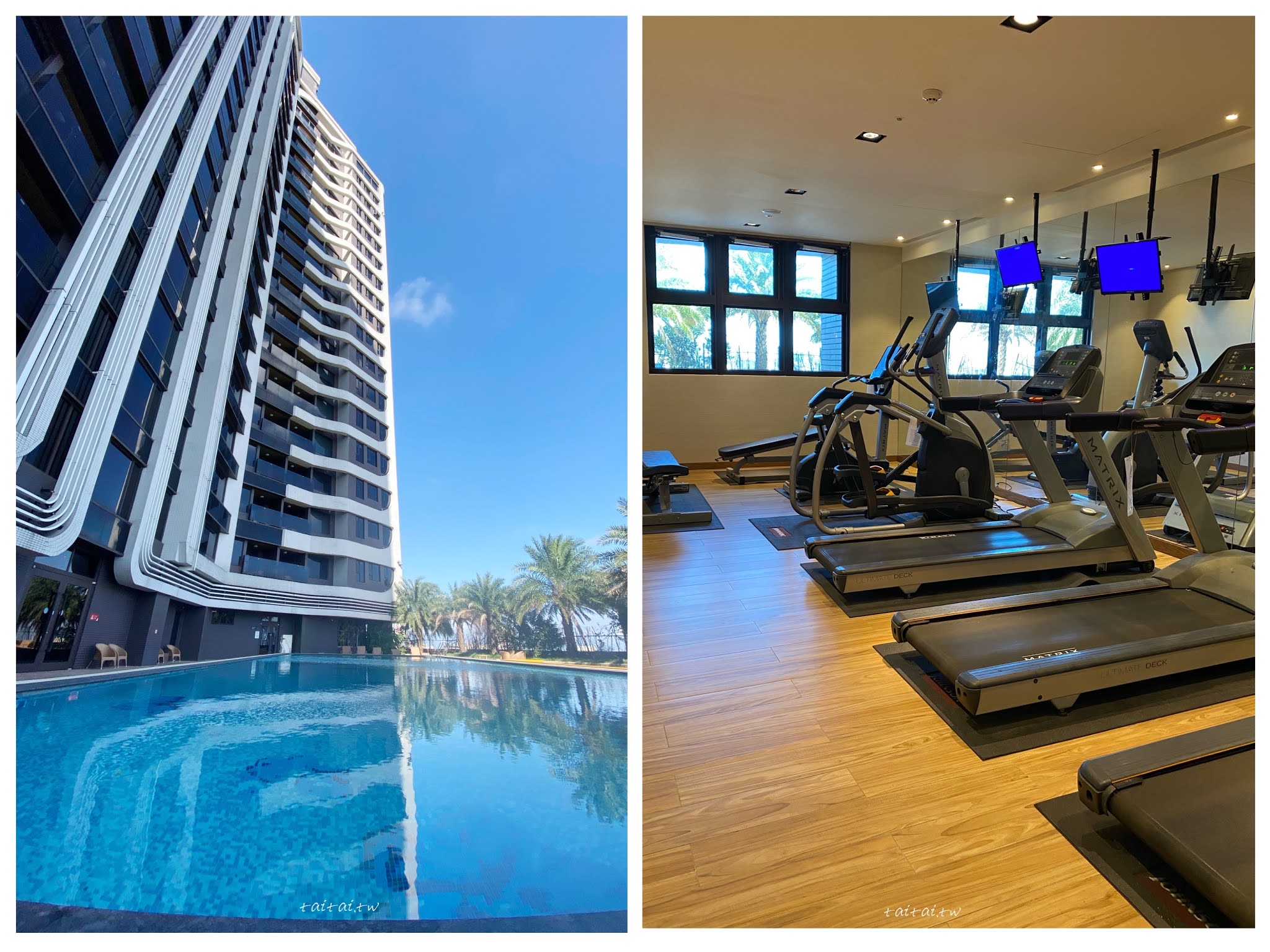 左邊是晴天的戶外游泳池,右邊是健身房的部分。