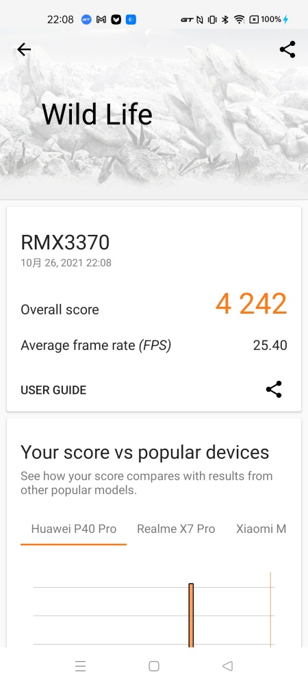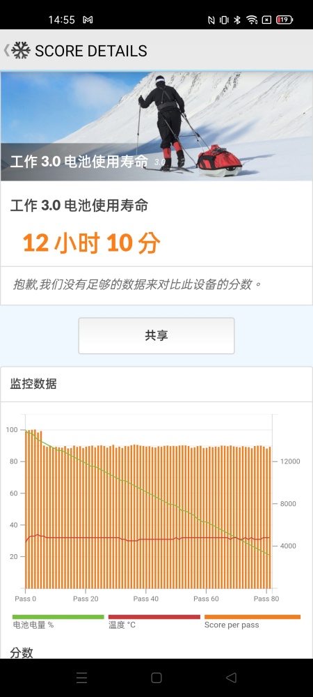 透過 PCMARK 對 GT Neo2 做續航力的測試,螢幕設定在 120hz 下,電量從 100% 到 20% 續航力為 12 小時 10 分,這個分數對於一整天的使用非常足夠,可以想像若是將螢幕設定在 60hz 的情況下,可以延長更多的電池時間。