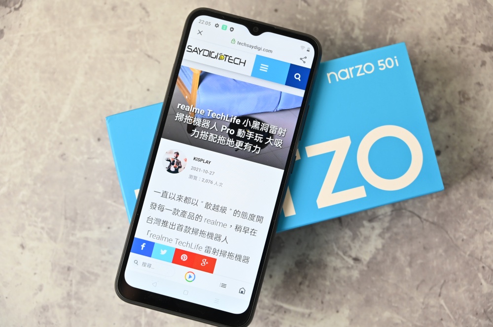 narzo 50i 款式則搭配 6.5 吋大螢幕、5000mAh 大容量電池,對於需求比較不高的使用者,瀏覽網頁、聽音樂也都很夠用,大容量電池也讓人不用擔心充電問題,還配有雙 sim 卡,出國旅行時可以把當地網卡直接插入,不需要再把台灣用的 sim 卡拔出來後無處可放。以及一個 MicroSD 擴充槽(最高可擴充到 256GB ),可以隨時擴充自己所需的容量。