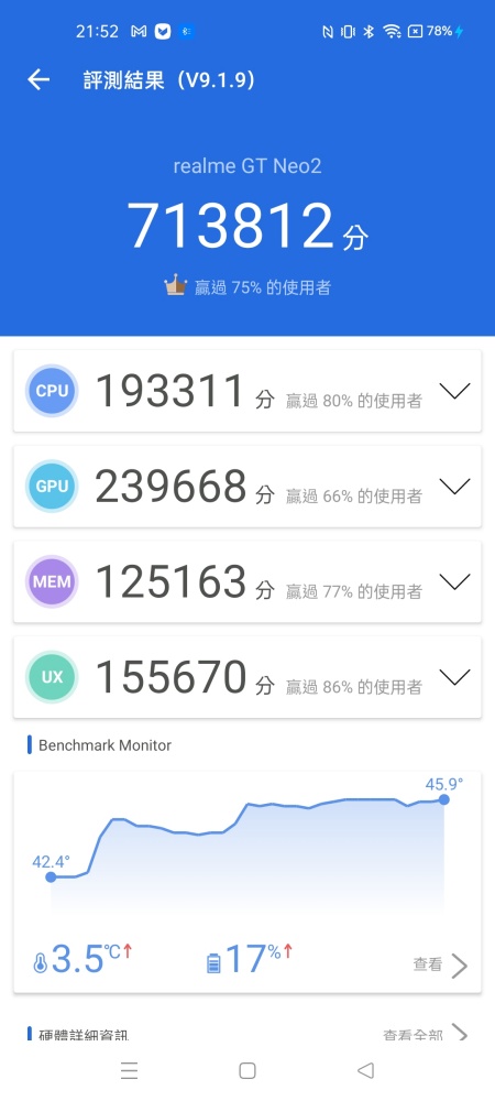 所以 realme GT Neo2 除了採用較不易發熱的 S870 旗艦處理器外,同時在處理器周圍採用類鑽石顆粒凝膠,搭配 8 層的 3D 立體結構鋼化 VC 散熱,可以把 CPU 所產生的熱能快速的傳遞到機身之外,而不造成機體高溫,進而降低手機整體的效能。這個類鑽石冰芯散熱系統可讓 S870 處理器不會因為散熱不易而降頻,讓手機執行錄影、直播、手遊這些高耗能用途時,不至於溫度過高、耗電量暴增,於此同時散熱系統的設置也可以間接延長電池的使用時間,可說是一舉多得的實用設計。以續播影片串流兩小時進行實測,手機表面溫度僅有微幅提升,期間的影像呈現也未有卡頓,其高效散熱功能可見一斑。