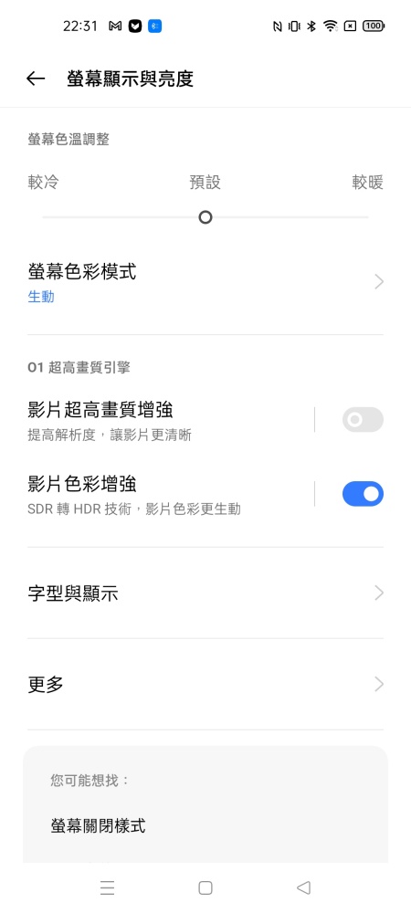 GT Neo2 的螢幕亮度來到 1300nit 的超高亮度,戶外艷陽高照時也不怕看不清楚螢幕,同時,其螢幕功耗比 E3 螢幕降低 15%,還使用 100% 的 P3 廣色域及 HDR10+ 的高色域範圍,讓使用者能看清楚影片暗處的細節。此外,手機還可以打開護眼模式,過濾藍光的功能減輕眼睛的負擔。