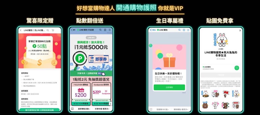 LINE 購物護照自從去年 7 月正式開通後,提供專屬優惠大受喜愛,現已有超過310萬用戶開通購物護照!今年雙 11 檔期,LINE 購物量身設計會員專屬活動,即日起至 11 月 12 日每日下午 1 點至 LINE 購物護照「搶 11 點 / 11 元好康」頁面,即有機會以 LINE POINTS 11點搶購多款好康小確幸商品!雙 11 當日下午一點至六點,每整點更提供限時限量 11 元的麥當勞、全家中杯熱美式等美食即享券,精打細算的消費者切勿錯過!只要開通購物護照,就能盡享多項會員限定好禮!