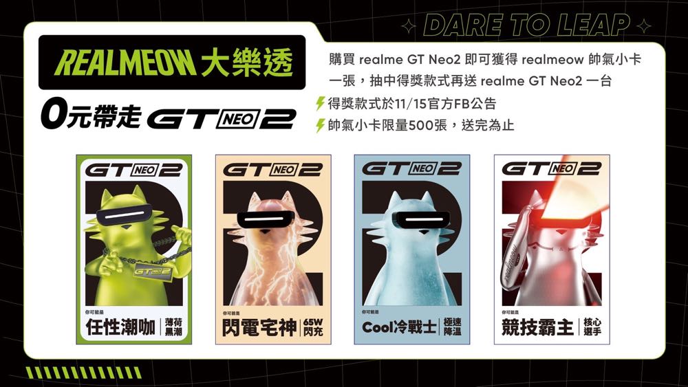 品牌通路獨家再加碼舉辦「realmeow 大樂透─0 元帶走 GT Neo2」活動,凡於首賣期間在 realme 網路商店或 realme 品牌專櫃購買 realme GT Neo 2,即可獲得realmeow 帥氣小卡一張,卡面共四種款式,realme 將在 11 月 15 日於官方 FB 公告得獎款式,抽中得獎款式的用戶將再贈送一台 realme GT Neo2 (隨機出貨,不挑色),小卡限量 500 張,送完為止,手速要快!