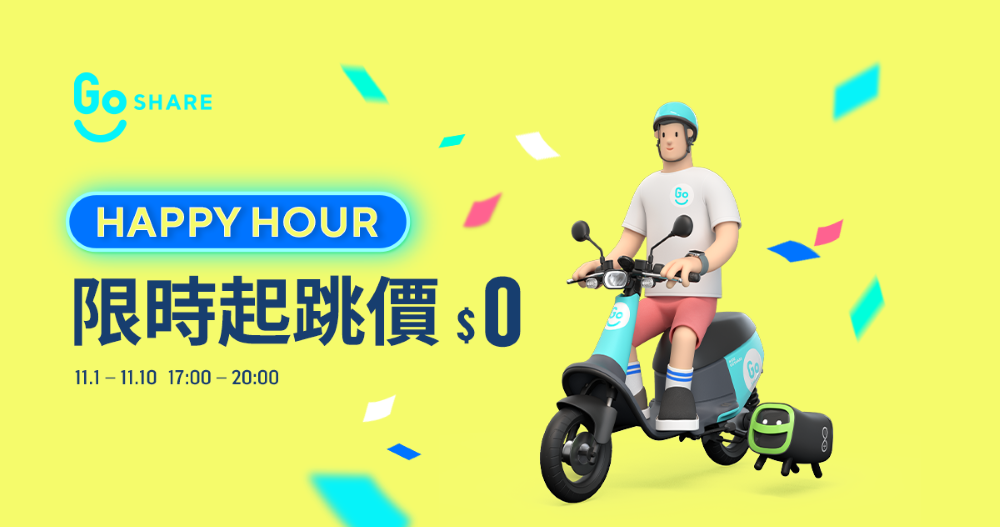 - 11/1 至 11/10,每天 17:00 至 20:00,租借全台「GoShare 隨借隨還」服務車款,趟趟騎乘均享前 6 分鐘起跳價 $0 元,之後每分鐘 $2.5 元。