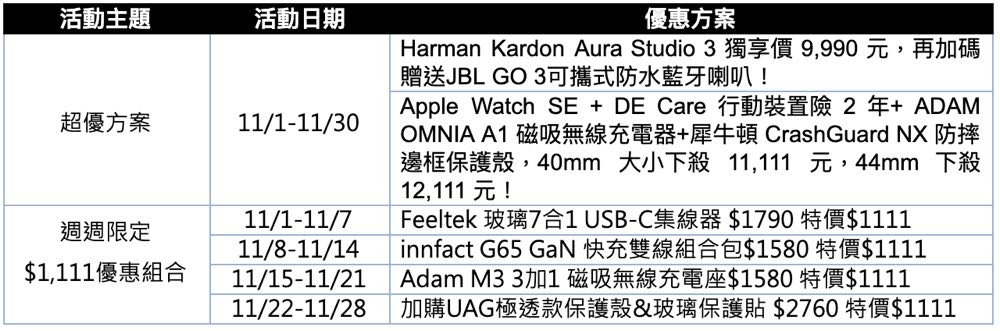 即日起至 11 月 30 日,德誼數位同慶雙11每周皆有產品下殺至 1,111 元,包含 Feeltek 玻璃 7 合 1 USB-C集線器、innfact GaN好爽!PD3.065W 雙線組合包、ADAM OMNIA M3 3加1磁吸無線充電座、iPhone13 系列加購 UAG 耐衝擊保護殼加玻璃保護貼。