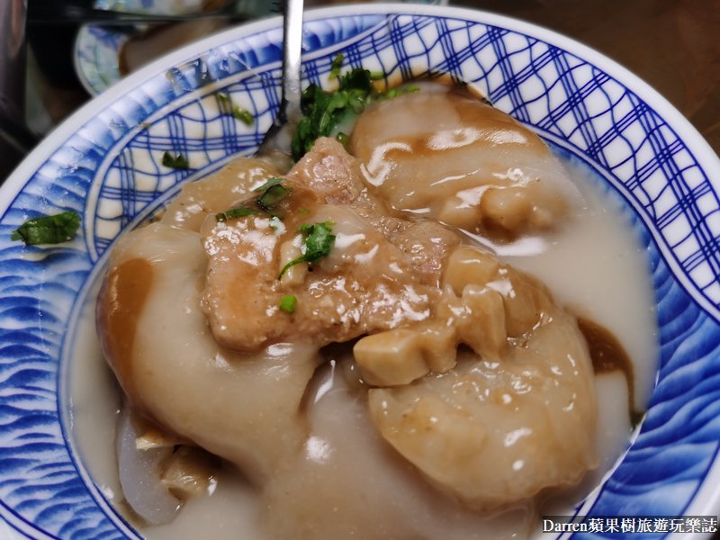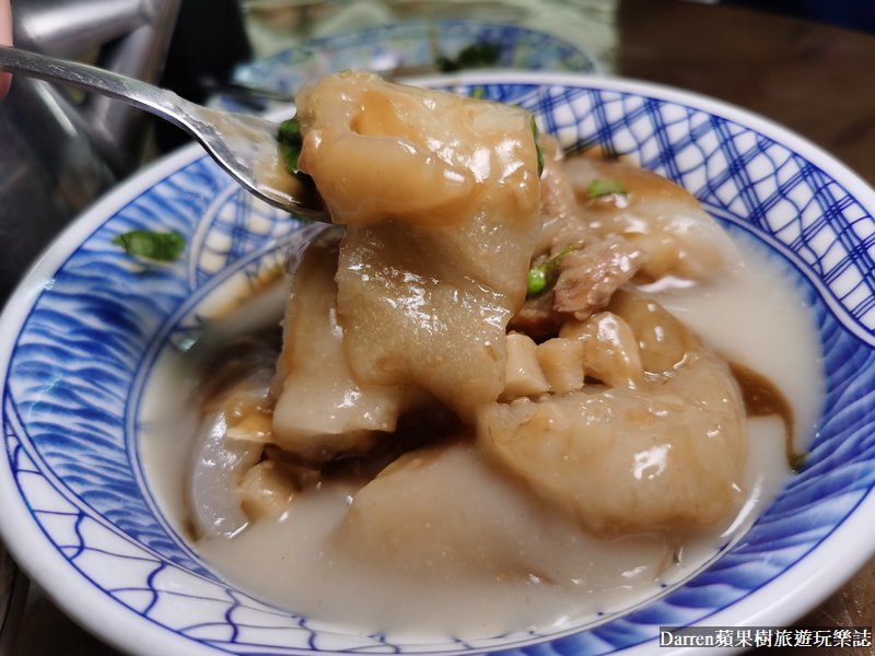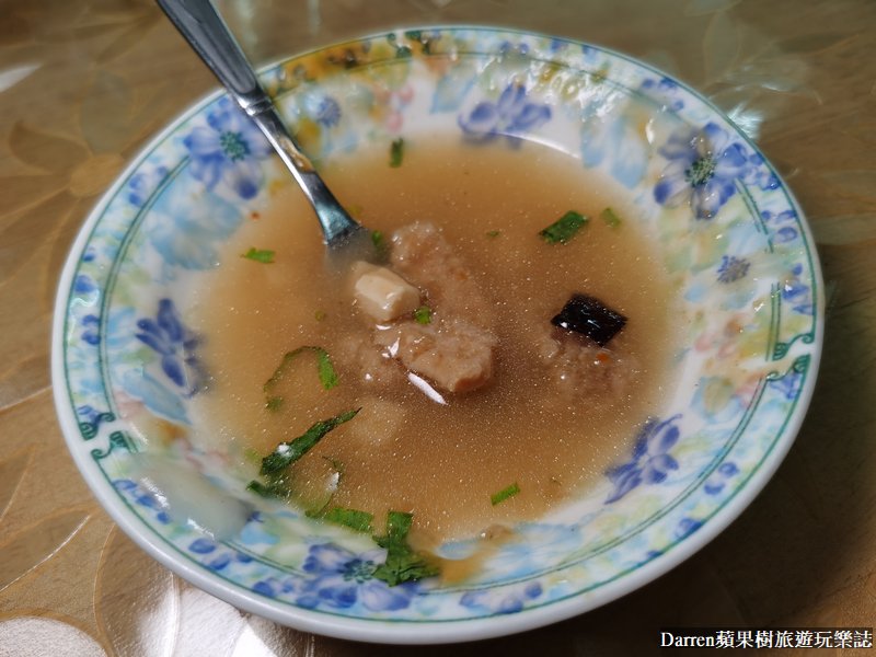 肉圓裡頭有肉塊和筍塊,肉塊以瘦肉居多成片狀,建議可以先吃掉肉圓皮,剩下內餡等著後面加上大骨湯