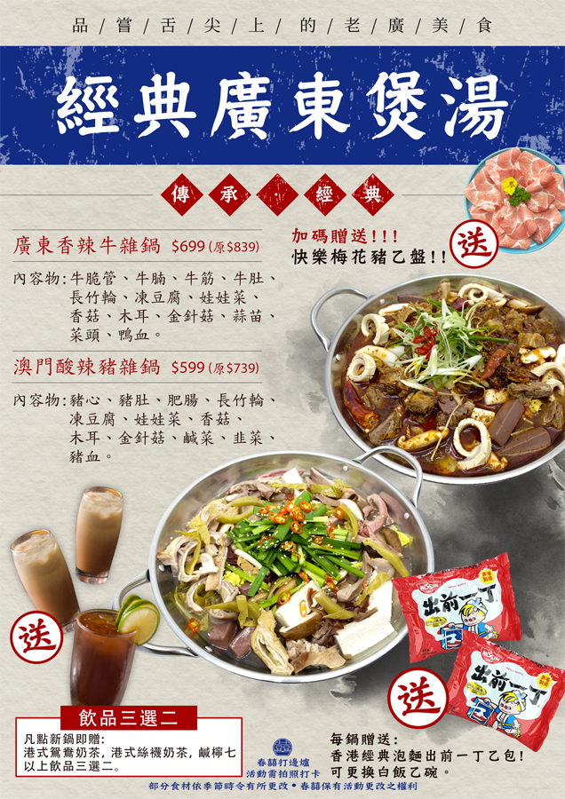 飲品還可以三選二,每鍋贈送香港經典泡麵出前一丁乙包(或者可以更換成白飯乙碗)