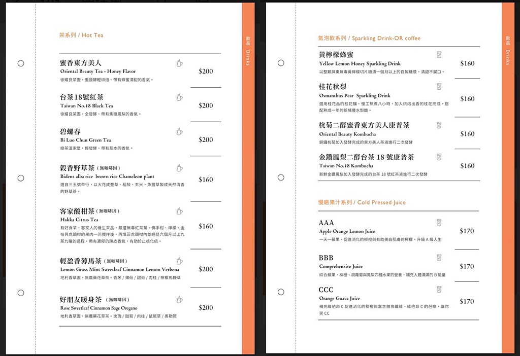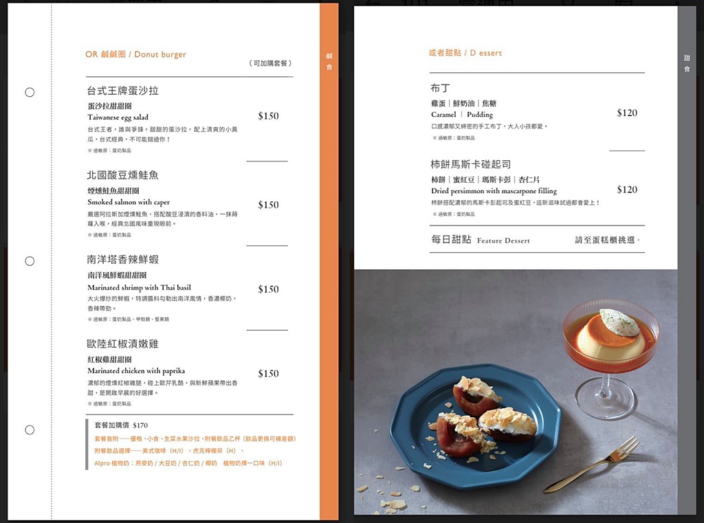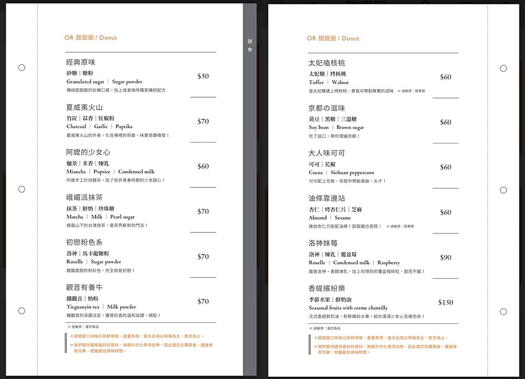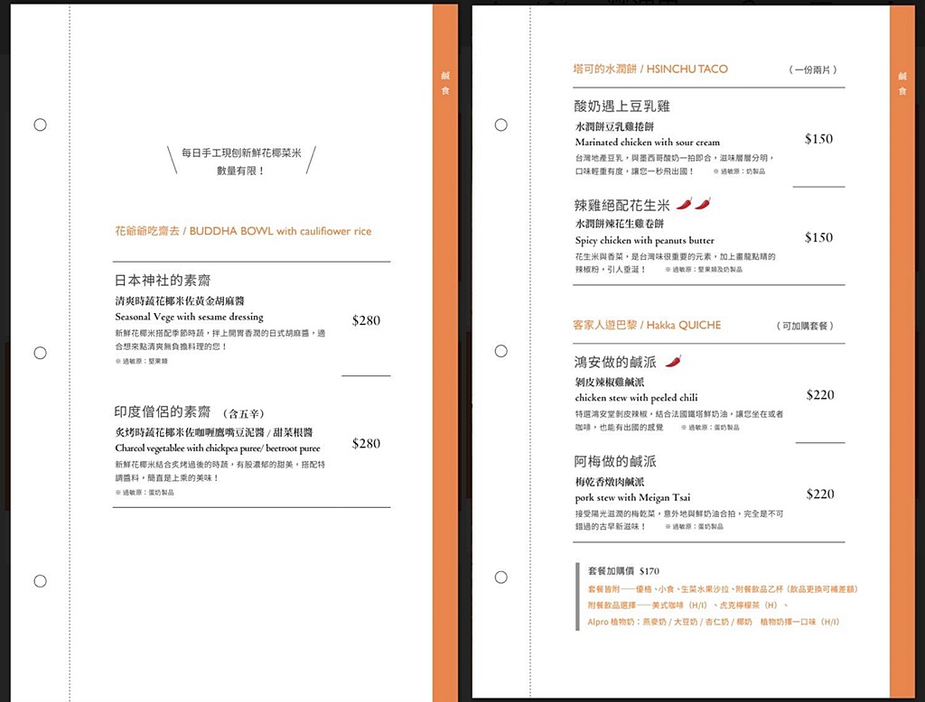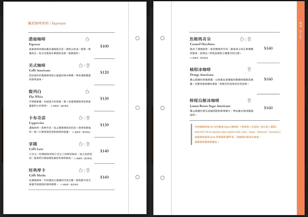 菜單出乎意料的豐富,提供非常多品項的飲品,包含義式咖啡、手沖咖啡、鍋煮奶茶、植物奶系列等,餐點部分也十分有創意,結合在地食材,提供每日手工現刨的新鮮花椰菜米料理、水潤餅料理、鹹派、甜甜圈、鹹鹹圈跟甜點~