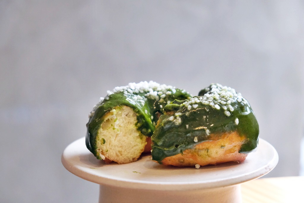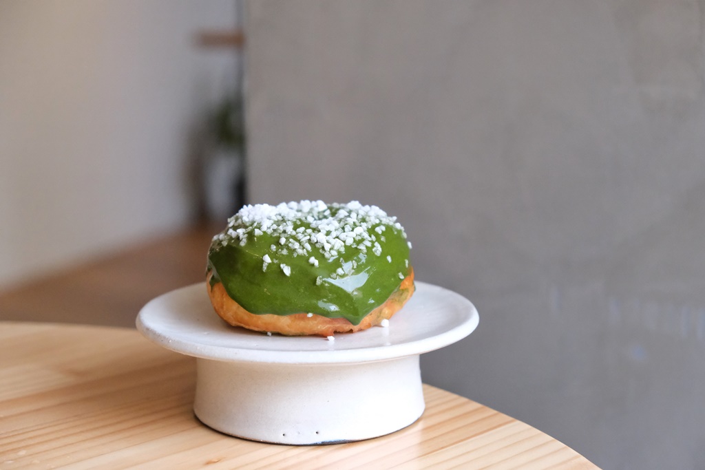 基底是原味甜甜圈,吃起來扎實帶點彈性,偏像麵包跟想像中的甜甜圈口感較為不同,不過我很喜歡它會越嚼越香,外層搭配來自台灣峨嵋山下的抹茶醬,吃起來濃郁偏苦,搭配珍珠糖才會有點脆脆甜甜的滋味,很特別~