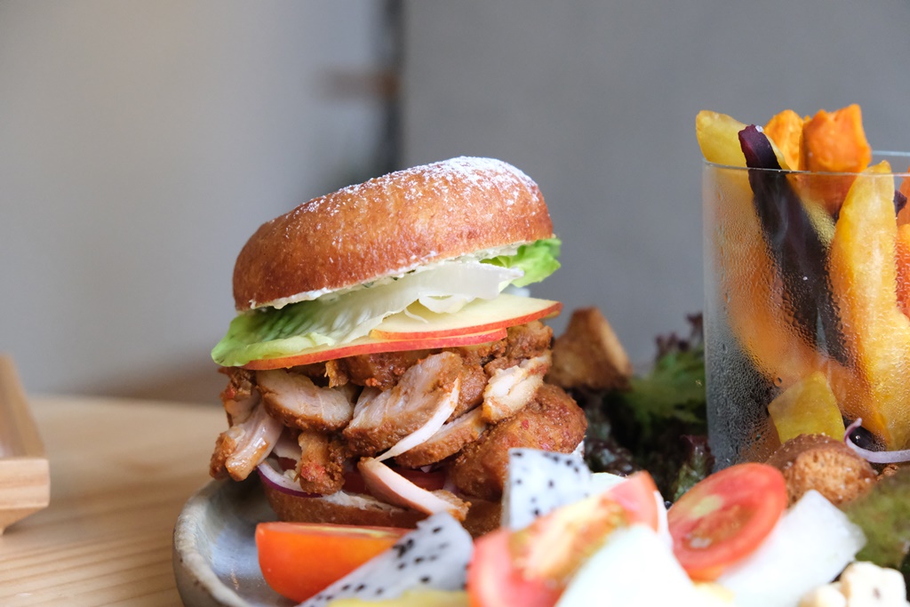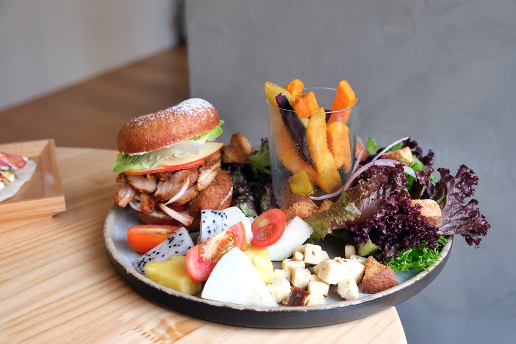 原本我們想點南洋塔香辣鮮蝦口味,很可惜賣完了~退而求其次點了這款…將甜甜圈塗上歐芹乳酪醬,內餡夾入濃郁的煙燻紅椒雞腿肉,看似會很重口味但其實完全不會唷,雞腿肉的調味是恰到好處,加上蘋果切片與生菜,搭著吃非常爽口不膩,大家最好奇的甜甜圈口感,我覺得很扎實,比較類似歐式麵包,並不是大家想像中的台式甜甜圈口感,所以做成鹹食是非常合理的,另外我們有加購升級套餐,套餐會多了生菜水果沙拉、小食、優格跟飲品,特別喜歡那杯三色地瓜條,是先水煮再烤,加上很簡單的調味,可以吃到地瓜最原始的甘甜,口感也極好!