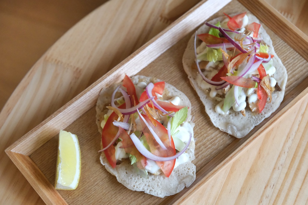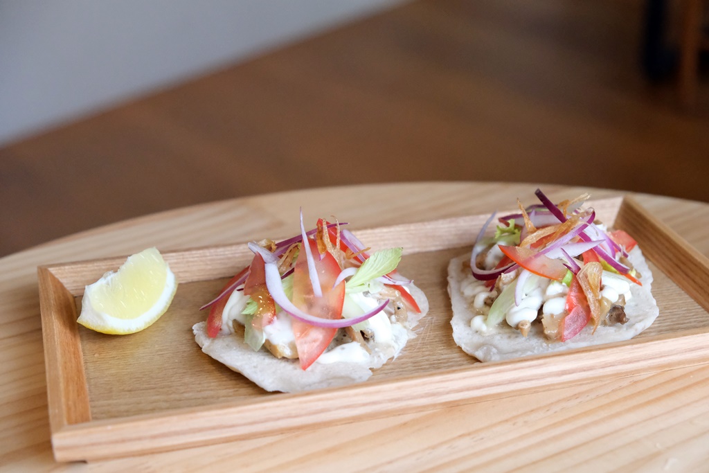 將水潤餅切成薄片,以類似墨西哥塔可餅的方式呈現,選用台灣豆乳雞結合墨西哥酸奶,中西合併的滋味還蠻融合的,不會有任何突兀感,搭配一些蔬菜、擠點檸檬汁,吃起來非常清爽~