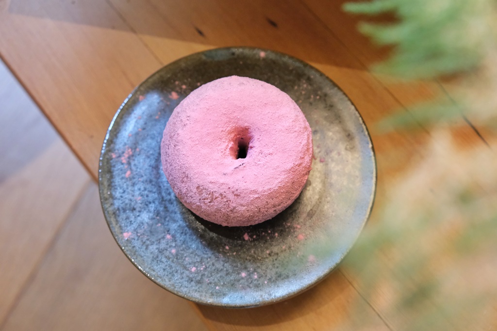 正當我們意猶未盡,考慮要不要再點一顆甜甜圈的時候,主廚突然送上這顆粉嫩的甜甜圈,讓我們瞬間戀愛啦!這顆甜甜圈的口感吃起來稍微不同,原來是因為原味甜甜圈賣完了,才改用全麥甜甜圈作為基底,而外層的粉色粉末是以洛神花製作而成,吃起來酸酸甜甜的,也是讓人很驚喜的口味呢!
