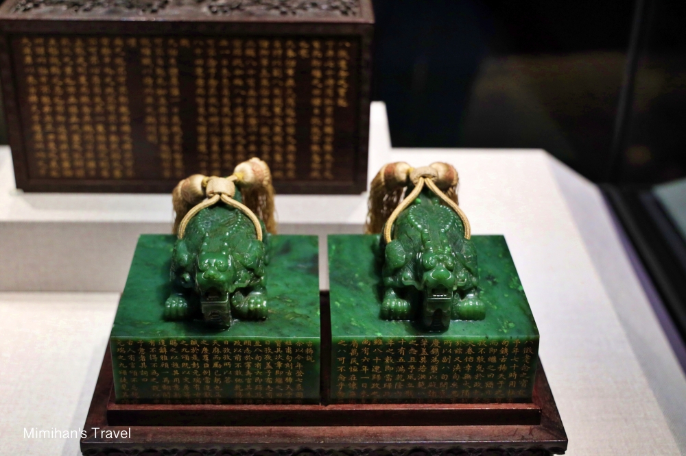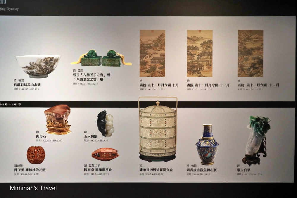 故宮南院最吸引我的就是人氣國寶展,全台灣共有346項造冊的國寶級文物,其中大部分都收藏在故宮博物院,像是從小學課本就會出現的翠玉白菜、肉形石,還有清雍正琺瑯彩瓷赭墨山水碗、清乾隆玉璽、清乾隆霽青描金游魚轉心瓶⋯等每一樣都是相當精美,而且很具歷史價值。