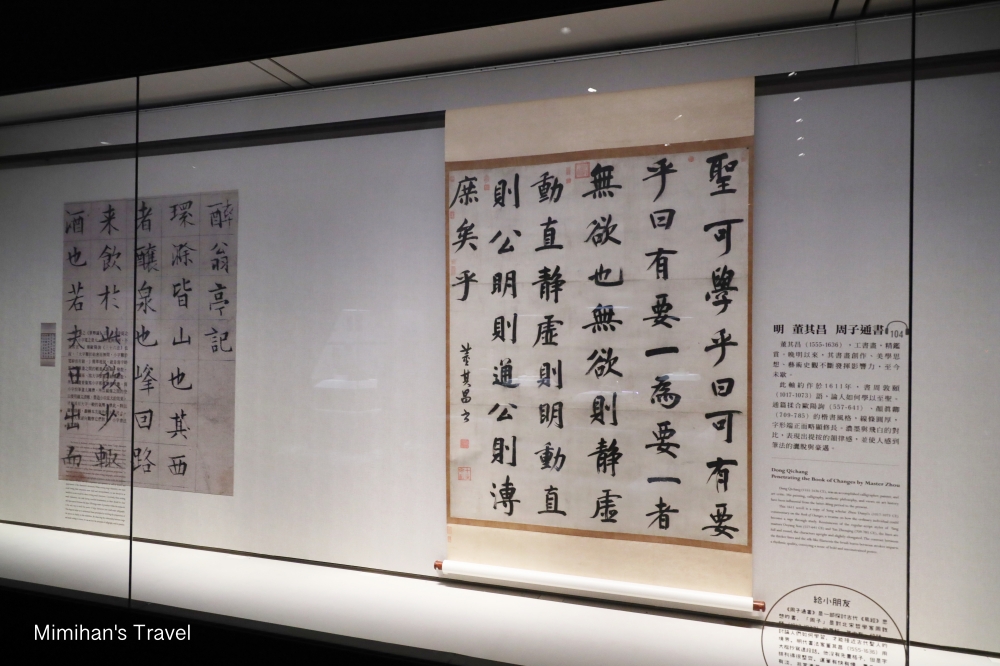 ▲明董其昌書周子通書軸(右)、文徵明書醉翁亭記軸(左),這些國寶級文物都會輪流在台北故宮和嘉義故宮南院展出,每次來都將有新的驚喜,有興趣進一步認識的話也可以在售票處租借語音導覽。
