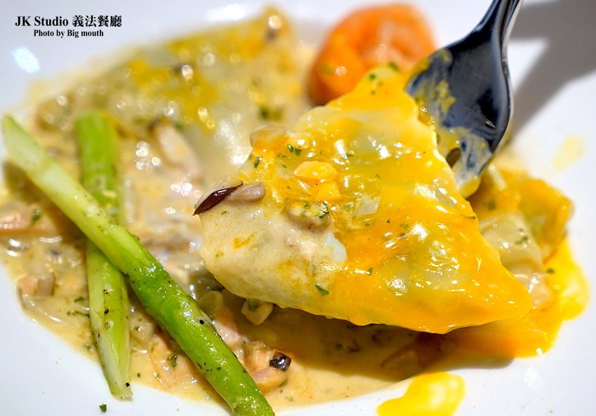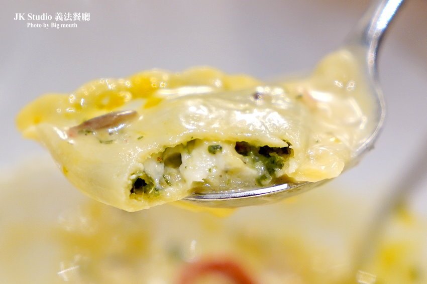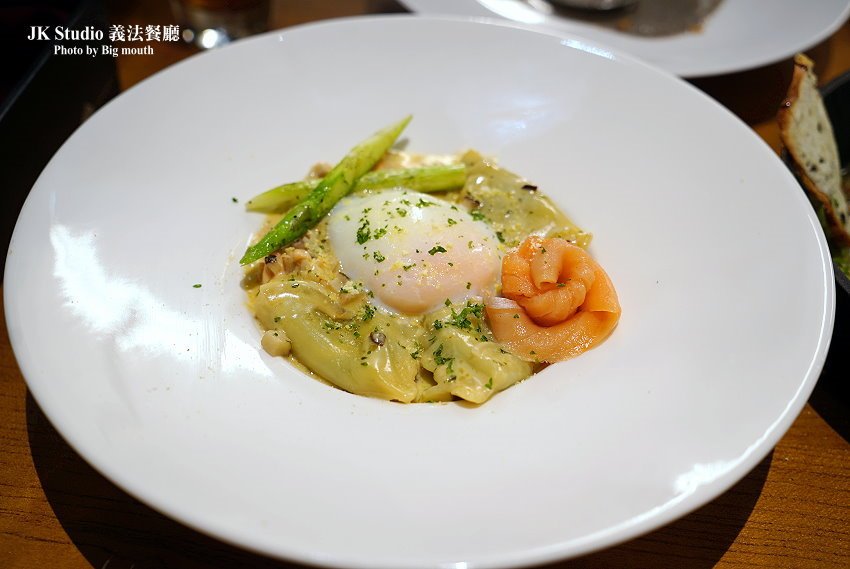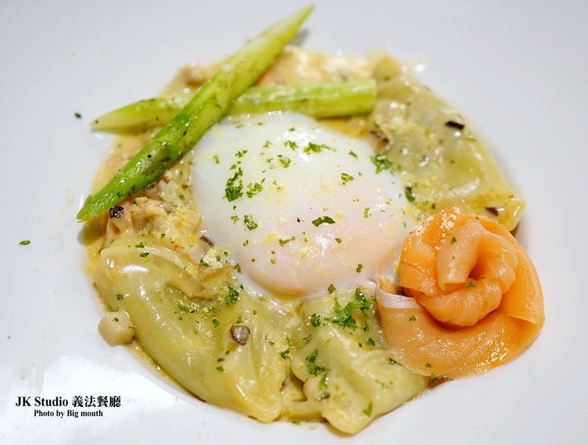 ▼燻鮭魚奶油蛋黃義式手工菠菜起司餃,上頭還放有水波蛋及捲成玫瑰花造型的燻鮭魚,讓人非常期待它的美味!