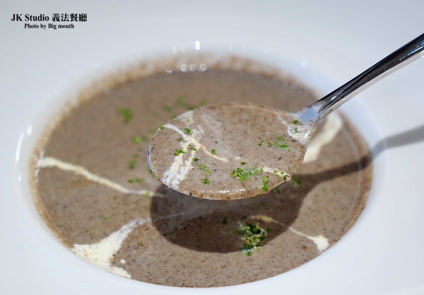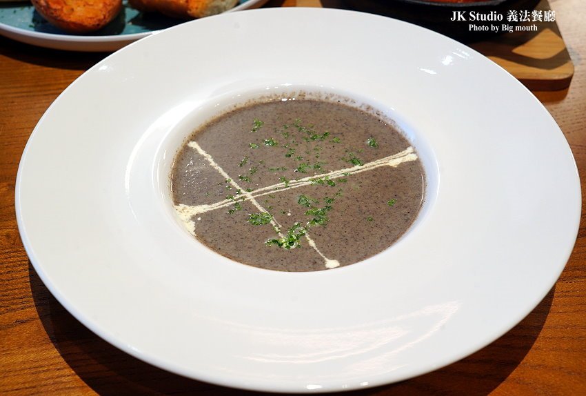 ▼松露野菇湯,裡頭採用自製高湯搭配黑松露醬、蘑菇下去熬製而成,上桌前再淋上鮮奶油裝飾!